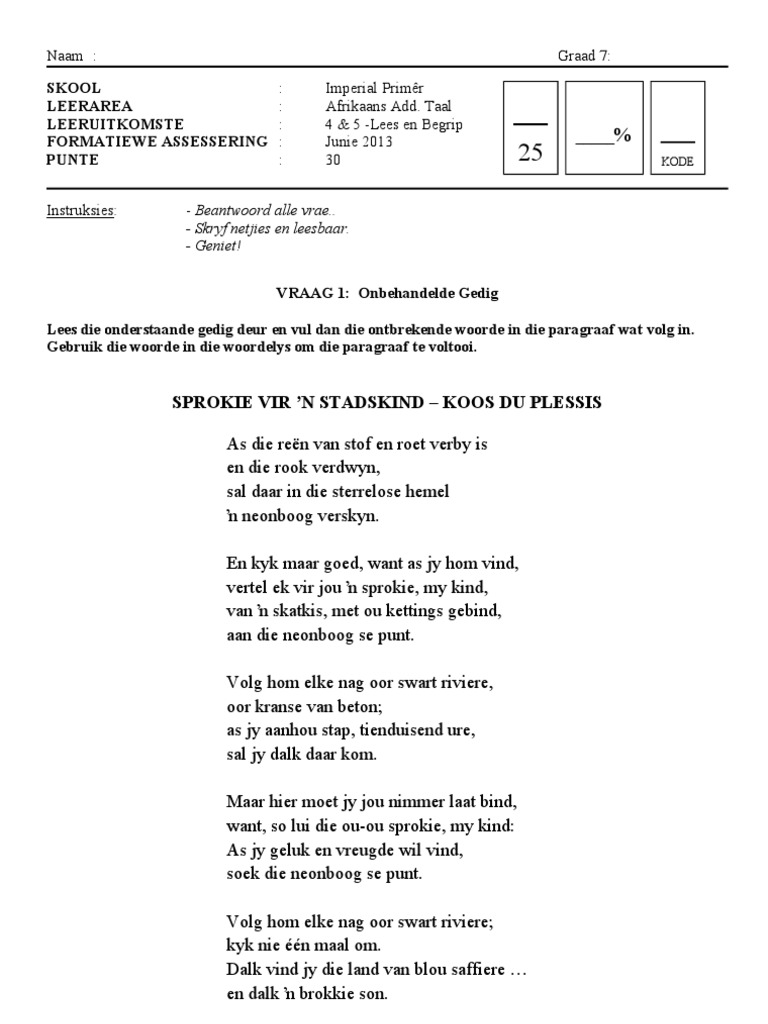 Afrikaanse Gedigte Graad 7 / 100 Gediggies Ideas Kids Poems Afrikaans Afrikaans Language - Die program bevat voorbeelde van vrae gevra in vorige jare se eksamen vraestelle.. Afrikaans eerste addisionele taal, graad 11 november eksamen. Some of the worksheets for this concept are graad 9 november 2012 afrikaans eerste addisionele taal, voorgeskrewe afrikaanse gedigte kies van die 3, graad 11 november 2013 afrikaans eerste. Afrikaans eerste addisionele taal, gr.12. Die piekfyn afrikaans leesboek is volgens die vereiste vir leesonderrig in die senior fase en die kabv ontwikkel. Android application gobe graad 7 afrikaans developed by go & be programming is listed under category education.